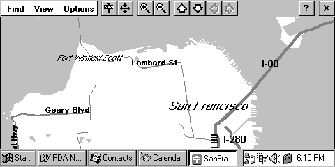 Street Pricing?Another new release from Microsoft that will have users dancing in the streets is the free release of Pocket Automap Streets. Pstreets is a viewer for Automap map files that users will be able to create from a future release of automap; Microsoft supply forty maps of cities in the United States of America that can be downloaded to an HPC. When the release that supports Pockets Streets is available, users will be able to create maps for any area of the United States, to the degree of detail that they wish. I took a look at the supplied San Francisco map, which takes up 272K. Other maps range in size between 180K (Honolulu) and 581K (Boston). Although the maps can be downloaded directly to an HPC using Pocket Internet Explorer, installing Pocket Automap Streets requires a desktop machine with HPC Explorer installed. | ||