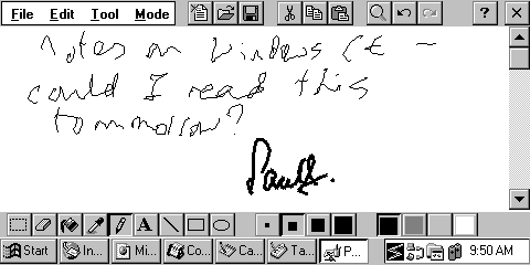 The essential part of PowerToys is the Cascade program. When transferred to the PDA and run, it installs an additional icon in the tray at the right hand end of the Task Bar. This icon will bring up a true cascading menu at the right of the task bar (normal CE menus are single level, and start at the left hand end of the task bar). These menus will also scroll to fit the screen, unlike the standard Windows CE menus. In some ways, I like the Cascade menus better than the standard menus in Windows 95; they clearly reflect the structure of folders that are used to build up the menu structure, for one thing. It will also allow you to open the submenu/folder in the Explorer program by holding down the Control key when you tap the menu item. I would like to see this menu system replace the standard menu system, with the menus starting from the left hand end of the Task Bar. Having both menu systems coexist on the same PDA is clumsy, and I find it disorienting. If you choose to install any of the three additional sound schemes (Analog, Metallic and Organic), the Mute program will also be an essential download. This also adds a new icon to the Tray in the Task Bar, this time one that will toggle on or off the speaker. Less essential is the Paint program, which is a cut down version of the Paint program found with Windows 95. Playing with Paint is even less exciting than experimenting with the full size version, but it has several uses for Windows CE users that might not be obvious at first. Because CE devices all include a stylus and touch screen, Paint is ideal to use to capture signatures from users. In the past I have created images of signatures to use on faxes and other documents by the time honoured trick of sending myself a fax with my signature on from a steam driven fax machine; but a CE stylus used on a Paint document will create a far better image. Although Windows CE doesn't include a hand writing recognition system, you can also use Paint to capture handwritten notes. This isn't as handy as it sounds, as you will have to transcribe the notes later if you need them in ASCII format, but it is a very useful facility to have. | ||