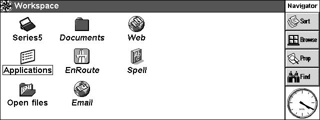 Navigator can be configured to replace the System display with one of the options in its Preferences panel. It provides a workspace display on which you can create shortcut icons to file browsers and applications or files. File browsers are similar to those in Windows 95, with minimise/maximise/close icons in the title bar at the top right, as well as an icon to create a shortcut for that browser on the workspace, and an icon to go back up a level in the directory structure. Files and folders have properties that you can edit. All windows, both the browsers and workspace, support drag and drop for file copy and move operations, which can be swapped between by holding down modifier keys as you drag, just like in Windows 95 (and MacOS, and Rhapsody, etc). Using the menus, it is possible to copy the contents of a file as well as just the file name. Copying files is very fast; a dialog box appears while the file is being copied with a cancel button, but on normal text files it appeared and disappeared before I could clearly register what was being displayed. | ||