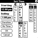 So what is so good about DateBk3 that justifies so much RAM consumption? It is a complete reworking of the Date application, incorporating the To Do List database. An extra week view is provided, that allows you to see the text of appointments. In the long term views you can assign icons to different appointments. The screen for setting appointment times lets you pick 5 minute intervals directly. You can create appointment templates, which are very handy if you need to repeatedly enter the same type of events, not on a regular schedule. As well as combining appointments with action items in the same display, it also implements a special type of appointment called a floating appointment; this will carry over to the next day if it hasn't been started by their start time. There are a lot more minor changes throughout the application, which will appeal to a long term Pilot user. One advantage is that it uses the existing Date and To Do List databases, so is fully backward compatible with the standard applications, and all data is backed up. I use it with TealGlance, which flashes up all current To Do List and Date items for a few seconds whenever I power on; the combination effectively reinforces any project tasks that are outstanding. DateBk3 is shareware, and costs $20 to register. |
